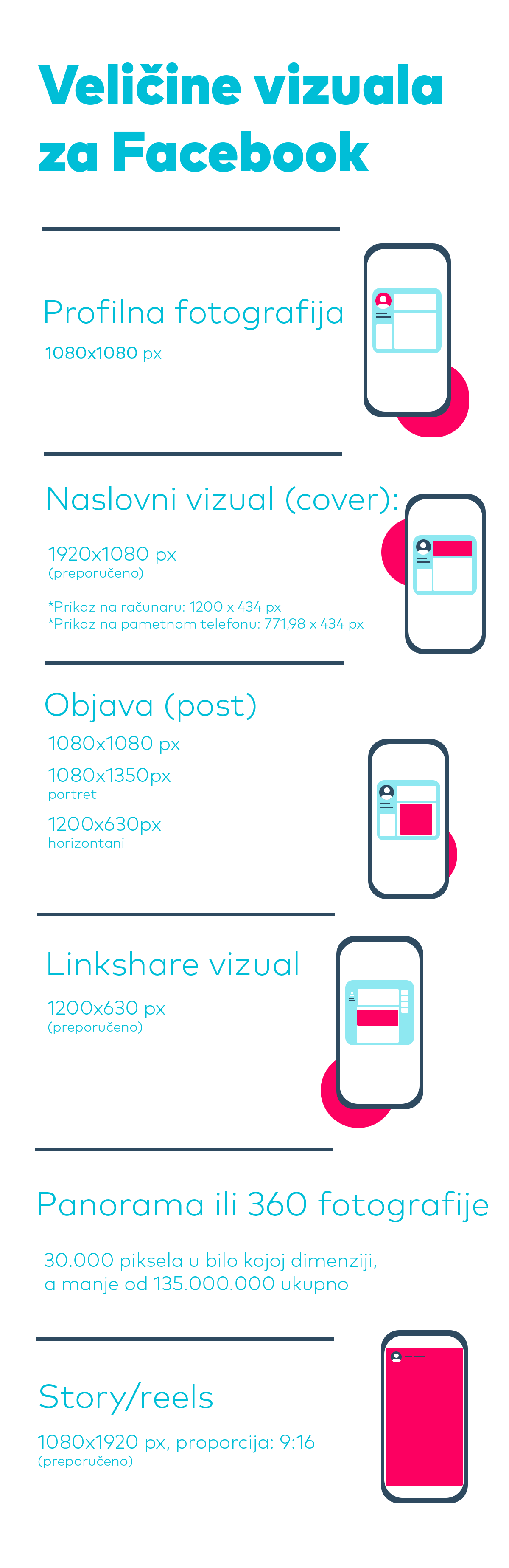 Facebook konstantno menja i unapređuje dimenzije vizuala na svojoj platformi. Stoga je najbolja strategija da uvek i u svakom trenutku postavljate vizuale u najvećoj mogućoj rezoluciji, kako biste izbegli da nakon nekog vremena oni izgledaju loše i neprofesionalno. Zbog toga je najbolje pratiti preporuke samog Facebook-a.