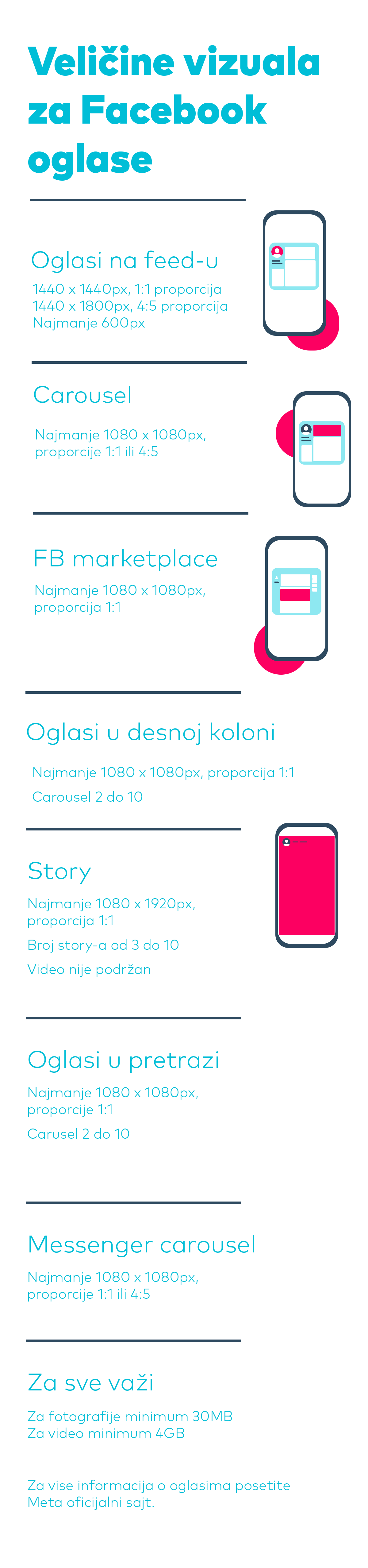 Za video sadržaj: dimenzije mogu biti od 256 x 144 px do 4096 x 2304 px, sa proporcijama od 1:2.4 do 2.4:1