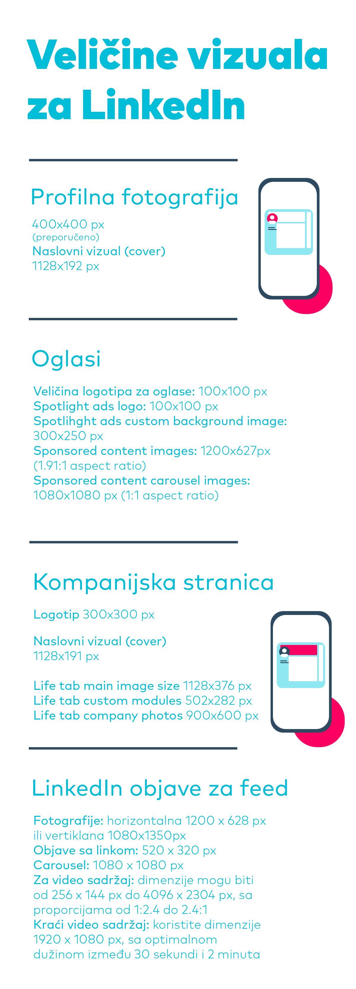 - Izbegavajte postavljanje ključnih informacija ili teksta u prvih 90px sa leve i desne strane zbog mogućeg preklapanja sa profilnom fotografijom na mobilnim uređajima.