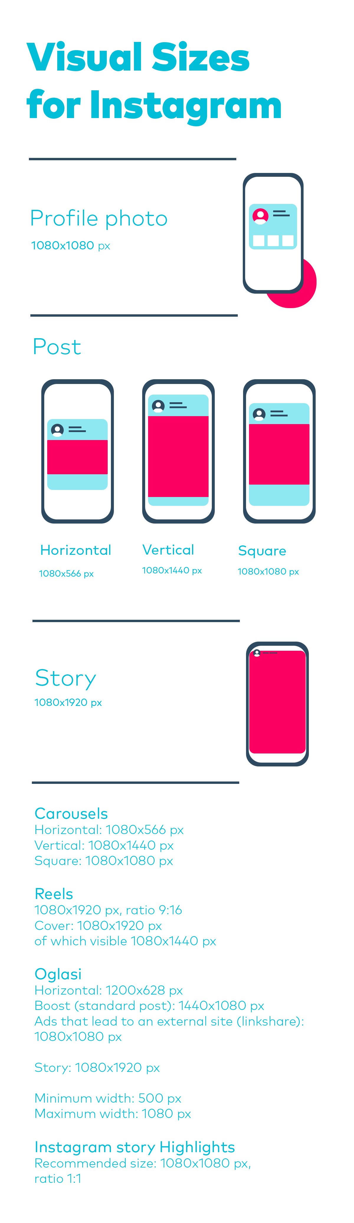 Instagram allows posting both horizontal and vertical visuals, although it still supports the classic square format (the well-known 1080x1080px) that made the platform recognizable when it first launched.